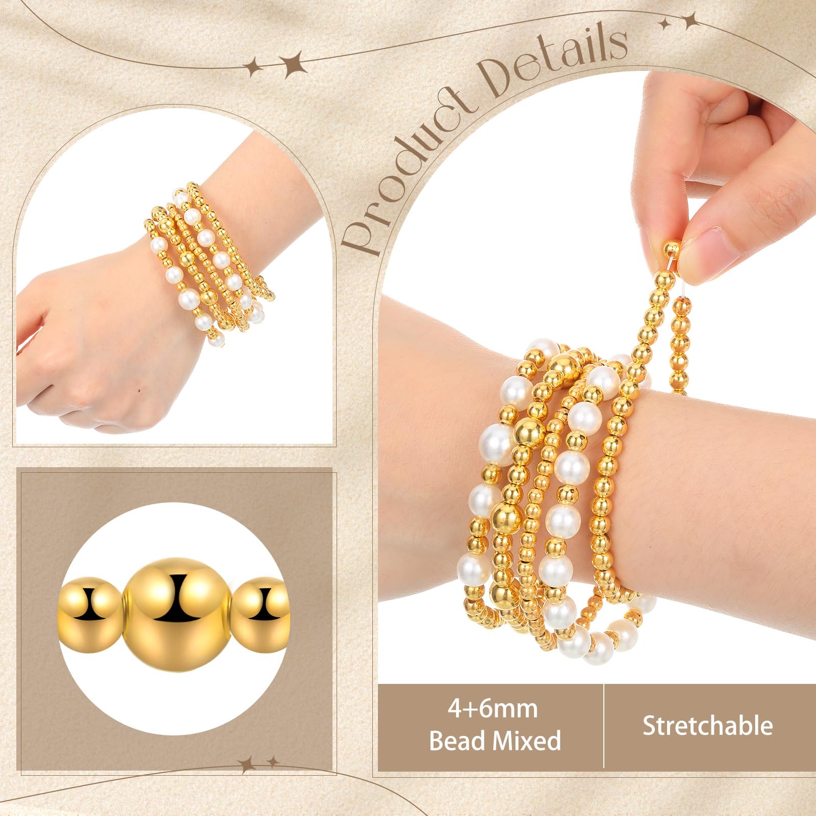 - Safe Material: the stackable pearl bracelet beads are made of quality plastic material, using electroplating process to ensure long lasting shine, suitable for sensitive skin, the elastic hand is connected with elastic cord, flexibly fits your wrist, smooth, light, textured, will not scratch your skin, ideal addition to women's jewelry boxes