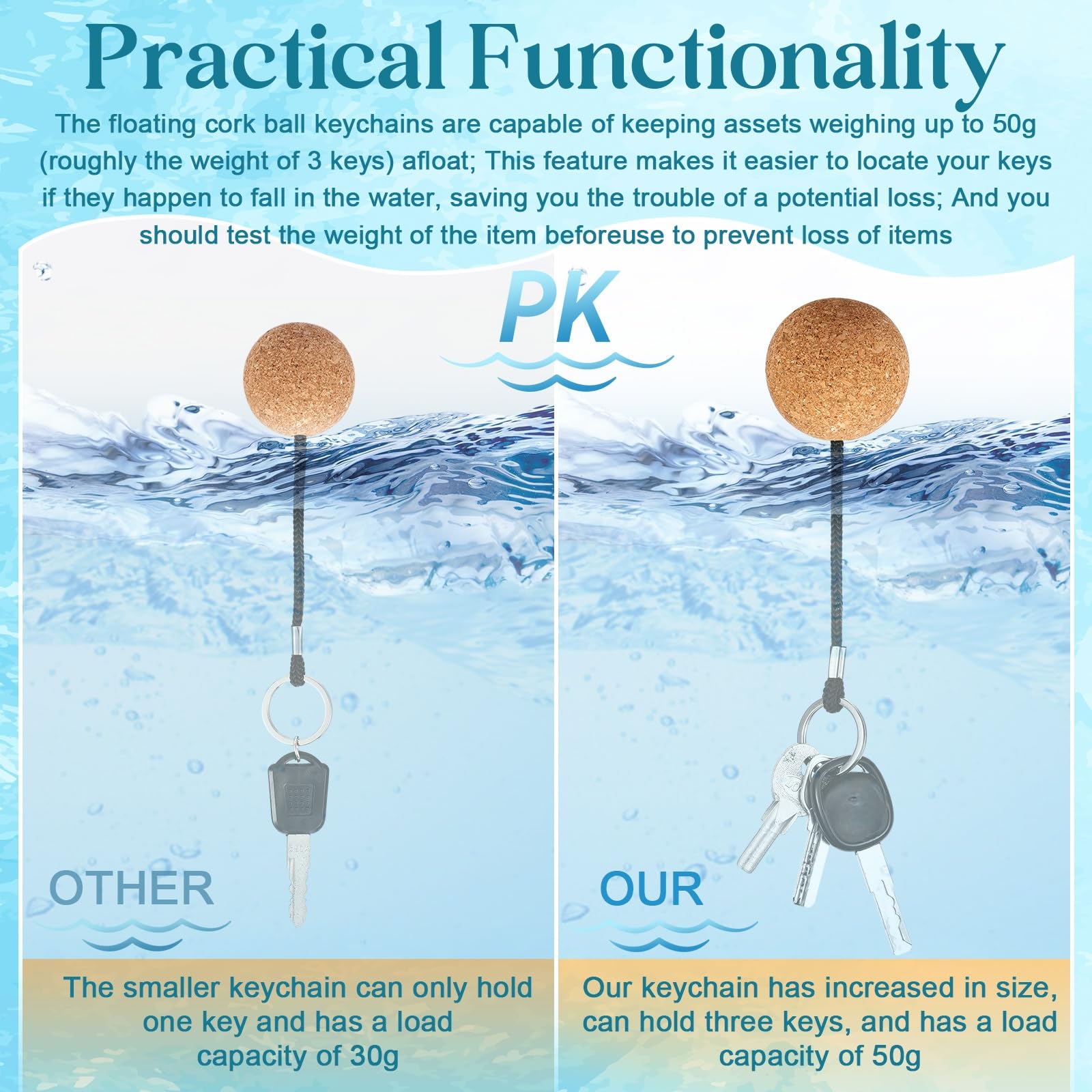 - Practical Functionality: the floating cork ball keychains are capable of keeping assets weighing up to 50g (roughly the weight of 3 keys) afloat; This feature makes it easier to locate your keys if they happen to fall in the water, saving you the trouble of a potential loss; And you should test the weight of the item before use to prevent loss of items