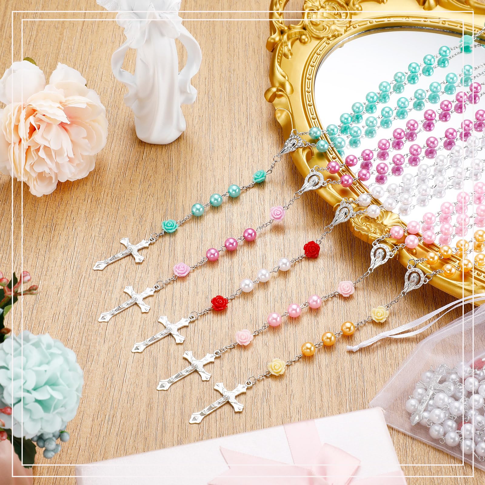 Ecation 20 Pcs Pearl Rosary Catholic Beads for Prayer Gifts Rose Cross Necklace for Women Holy First Communion Rosary Beads