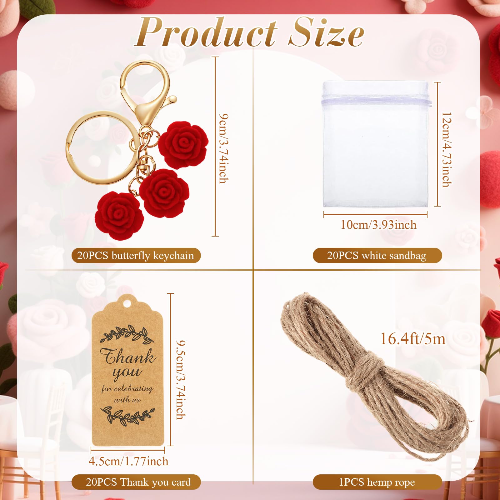 - Party Gift Set: this rose gift set includes 20 pcs red rose keychains, 20 pcs thank you tags, 20 pcs white organza bags, 1 bundle of hemp rope; They are suitable as gifts to share your appreciation with friends and loved ones