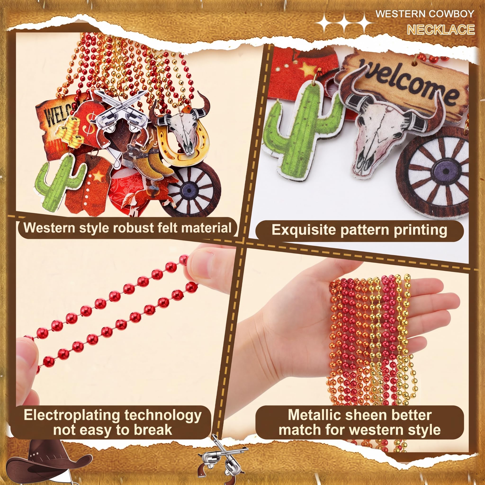 - Experience Western Elegance: these cool beaded necklaces bring the western charm to your party with our wild west party supplies embodied; Boasting classic enchanting western elements, from hats to lucky horseshoes and rustic yak skulls; The design is realistic and the colors vibrant, setting the ambiance for a rollicking western themed party; The variety of gold, brown, red, and bright colors will impress your guests and make your event unforgettable