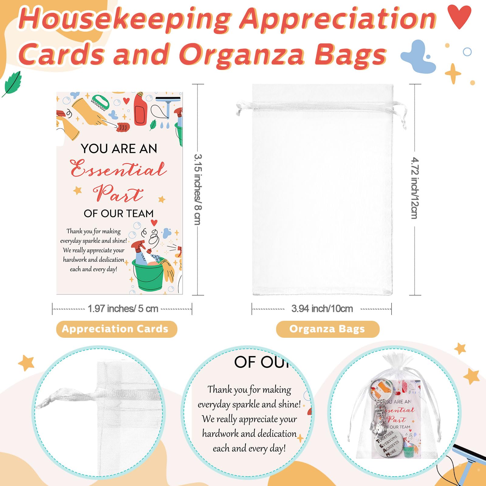 - Ample Quantity: receive plentiful benefits with our housekeeping appreciation gift package that includes 15 thank you cards, 15 keychains, and 15 organza bags; This generous quantity accommodates coworkers, housekeeping staff, and employees or extended distribution during housekeeping week
